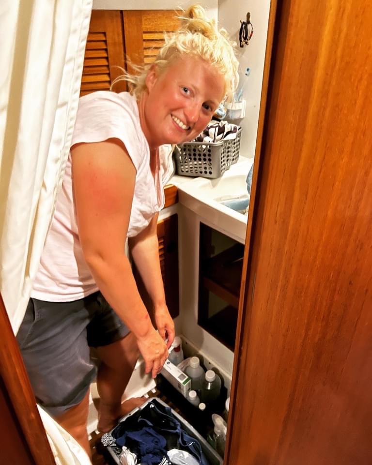 Planen var att nattsegla ner längs Sardiniens ostkust men vinden dog och krabba vågor rullade in. Vi bestämde oss för att släppa kroken i viken vid Costa Smeralda. Gårdagens rester blev middag medans solen gick ner. Skepparn går ner med disken. Vad är de som låter? En pump som går… Färskvattenpumpen! Stänger av! De låter som att de sprutar vatten inneifrån toaletten, och de gjorde de. Hela skåpet under handfatet var vattendrängt och alla badkläder har fått sig en ofrivillig tvätt 🤣 Slangen till kranen hade gått av. Nu återstår att torka rent och hitta en ny slang eller kran så fort vi får möjlighet.