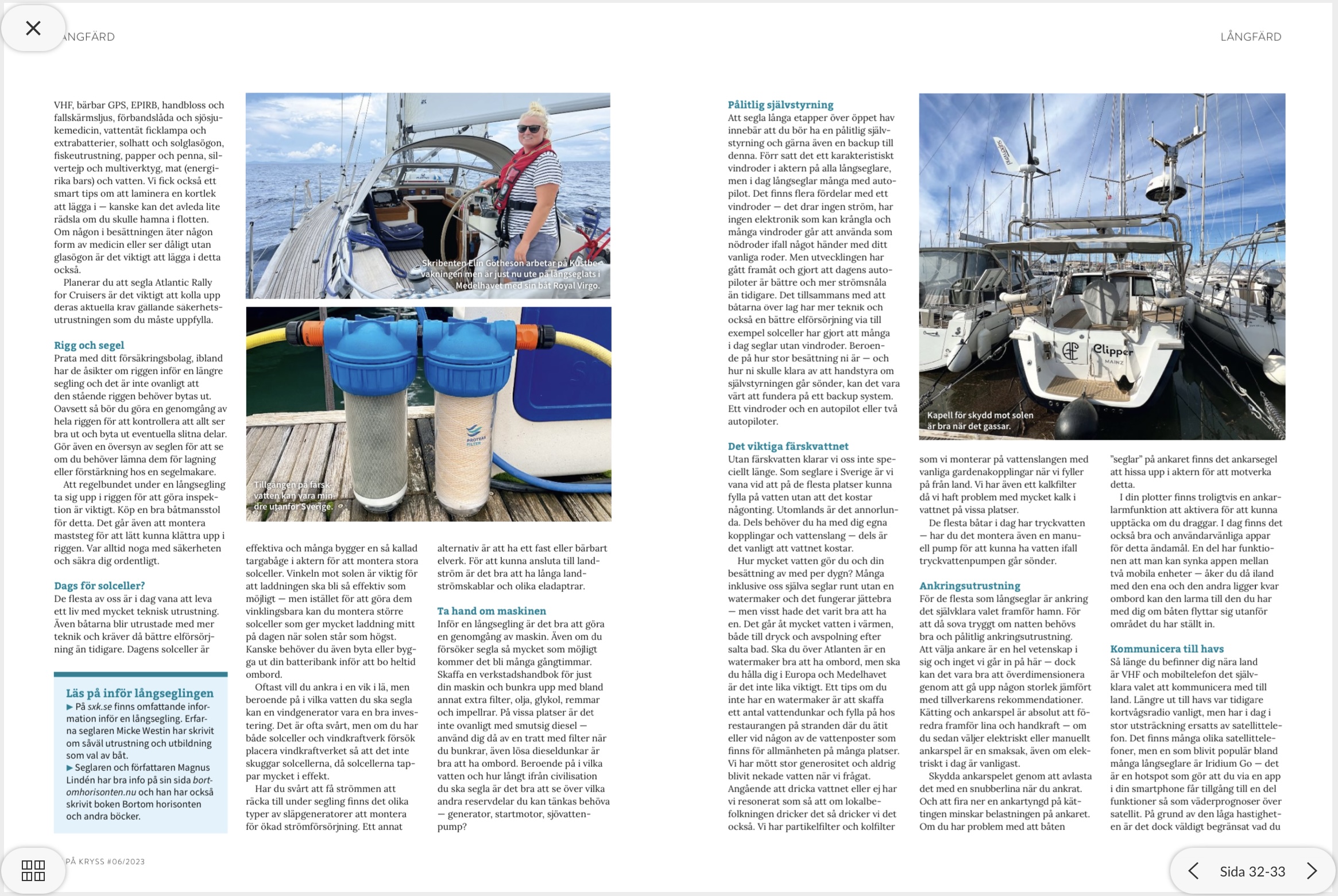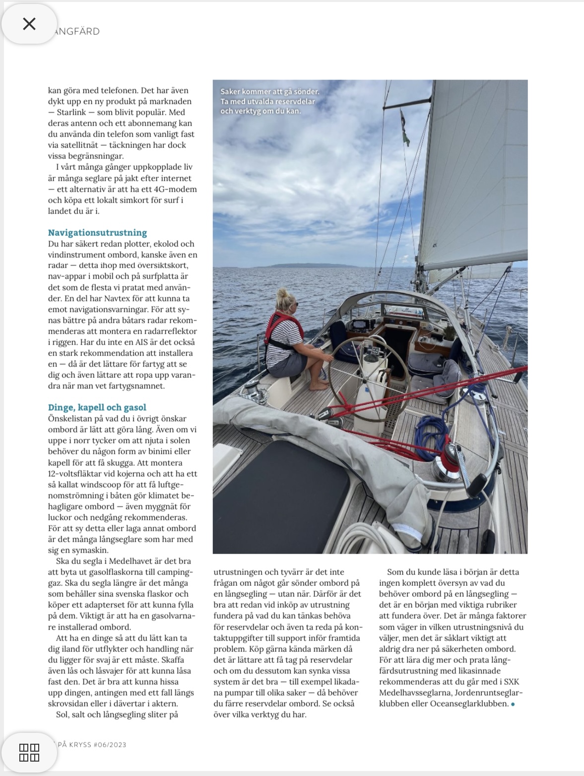 I På Kryss nummer 6 2023 har Elin skrivit en uppföljare sin långseglingsartikeln i nummer 2 2023, denna gången handlar det om bra utrustning att ha på sin långfärdsbåt.
