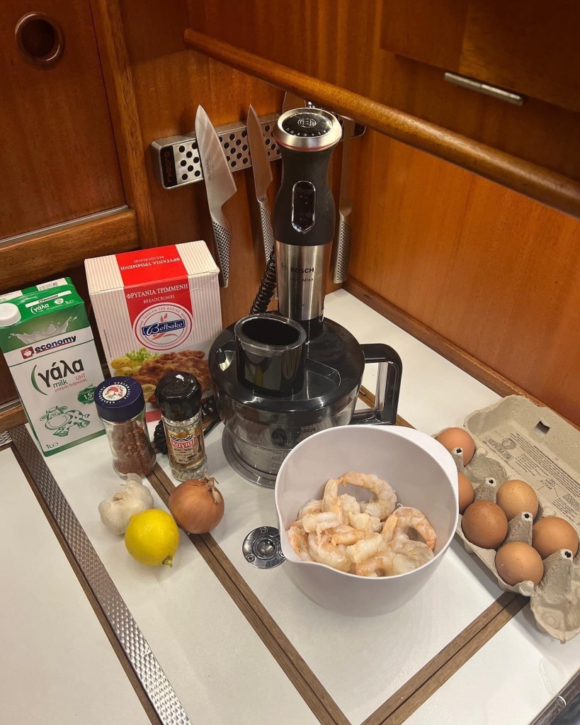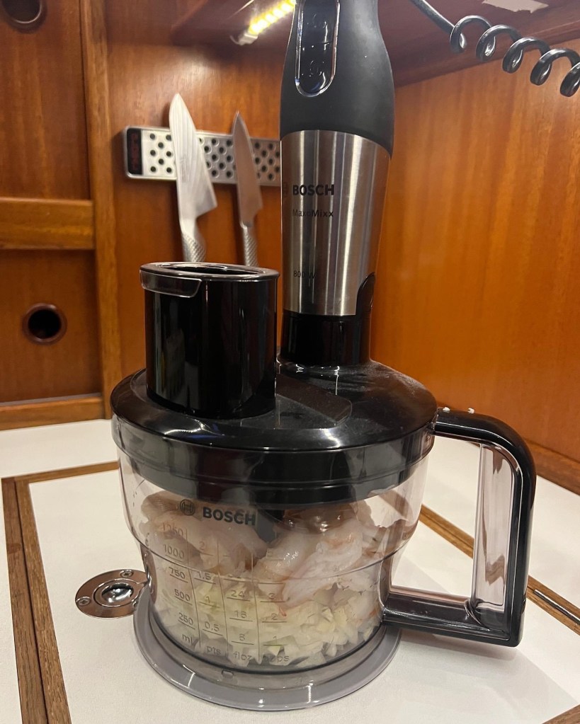 Finhacka lök och vitlök och lägg tillsammans med räkorna i en beredare/kvar