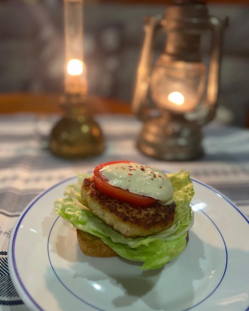 Denna gång serverade vi på ett vitt bröd stekt i olivolja och smör, sallad , gul lök, tomat och hemmagjord aioli.