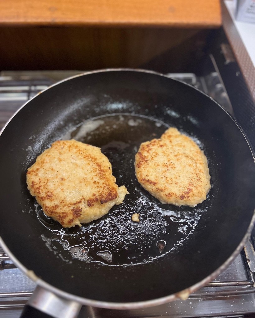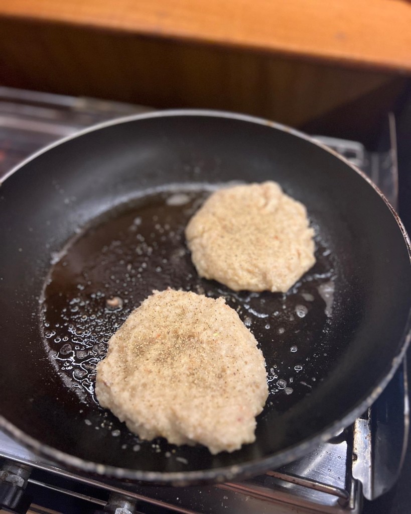 Gör fyra stora bollar som du trycker ut i stekpannan till önskad tjocklek. Eftersom räkorna är kokta innan så räckern det med att steka tills dom fått fin färg. Stek i smör