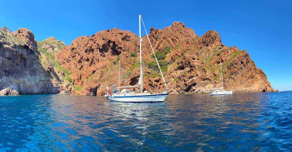 Vi körde mestadels för maskin ner längs Korsikas västkust då det som det så ofta är i medelhavet var avsaknad av vind. Besökte det häftiga naturreservatet Scandola där det en vecka efter att vi var där skulle visa sig komma in en förödande storm. Men då var vi redan mellan Sardinien och Sicilien och märkte ingenting. I Santa Teresa på norra Sardinen mötte vi en svensk Rassy och fick trevligt umgänge några dagar innan vi hissade segel mot Sicilien. Men för att forcera lite följde vi Siciliens norra kust, genom Messinasundet där vi träffade på en intressant taxichaufför som vi ska berätta mer om vid ett senare tillfälle. Vi fortsatte norrut på Italienska stöveln där vi hade stora bekymmer med åska. De gjorde att vi höll oss kustnära istället för att snedda över till Grekland som tanken var från början. Men åska kräver respekt och man känner sig väldigt liten ute på havet när åskan är runt omkring en.