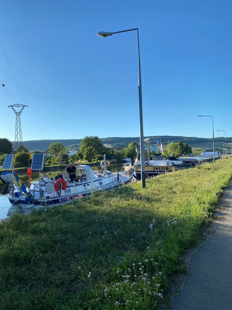 Vi kom fram till Nancy där det sa stopp. Vi körde aldrig fast i leran vilket vi är enormt tacksamma för även om det var nära. Vattnet var för lågt för oss att köra in i någon hamn men efter två veckor längs kanalkanten fick vi äntligen klartecken. Royal Virgo fick åka lastbil från Nancy till Port Saint Louis, där vi skulle kommit ut kanalvägen och vår mast låg och väntade.