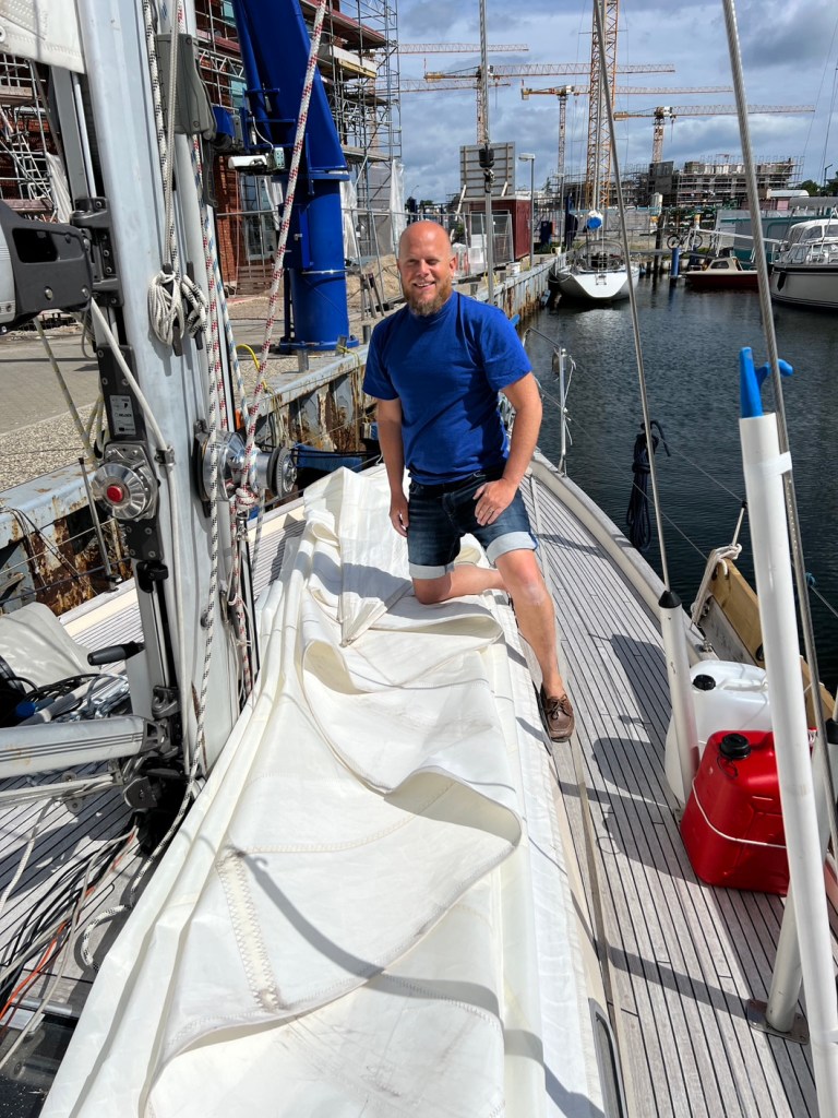 Karlans lastbil hämtade Royal Virgo och vi tog tåget till Tyskland. Hon lyftes på en torsdag och sjösattes igen på måndagen på Ancora Marina i Neustadt. Här skötte marinan både lyft och påmastning. Men vi både förberedde masten själva och fixade allt annat som hade med riggen att göra förutom själva lyftet.